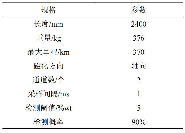 (1)技术原理。智能清管技术能够充分利用日常管道清管时机,通过常规清管器、测径清管器、钢刷清管器、变形清管器和漏磁清管器等一系列清管措施,对管道内部各类缺陷(凹陷变形、腐蚀减薄、焊缝异常等)进行检测。在清管作业过程中,它可以实时采集管道内壁的厚度、腐蚀情况、缺陷位置等信息,为管道的维护和泄漏预防提供数据支持[3]。表 2为常规漏磁清管器技术参数。