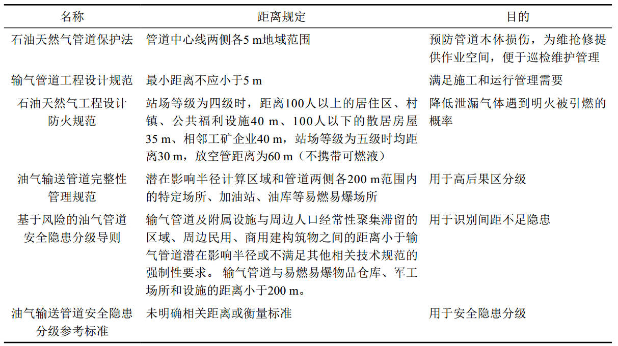 (2)规范层面。目前国家还没有制定与《石油天然气管道保护法》第十三条和三十一条相配套的技术规范。GB 50251―2015《输气管道工程设计规范》规定,埋地管道与建(构)筑物的间距应满足施工和运行管理需求,且管道中心线与建(构)筑物的最小距离不应小于5 m。其条文说明解释该5 m距离的依据是《石油天然气管道保护法》第三十条规定,同时兼顾了管道施工和运行维护需要。GB 50183―2004《石油天然气工程设计防火规范》仅对不同等级的天然气站场和放空管与周边人员、建(构)筑物的间距作出了具体规定,但其条文说明中将这些距离解释为防火距离而非安全距离。GB 32167―2015《油气输送管道完整性管理规范》则是通过地区等级、潜在影响半径及管道中心线两侧各200米等条件来确定高后果区分级,并非对安全距离的直接规定。GB/T 34346―2017《基于风险的油气管道安全隐患分级导则》中虽然在附录D表D.1隐患处置方法中提到与周边人员、建(构)筑物安全距离不足,但全文未明确安全距离的具体数值或定义,而是将间距不足作为隐患识别的方法,具体间距则以输气管道潜在影响半径或不满足其他相关技术规范的强制性要求来界定。