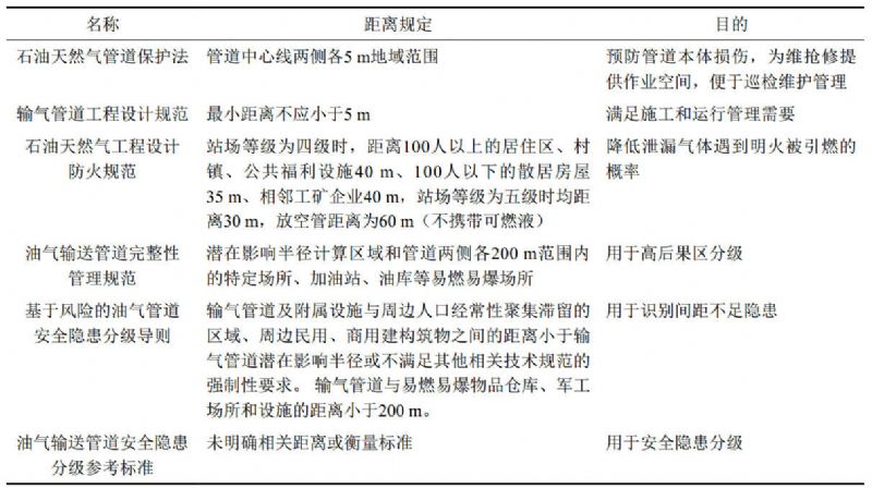 表 1 现行法律、规范、标准对管道与周边人员、建(构)筑物距离的相关规定