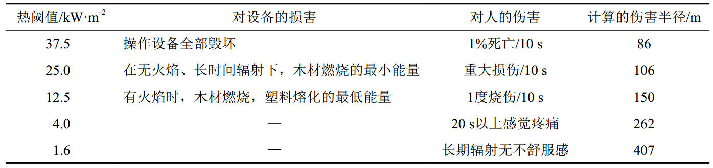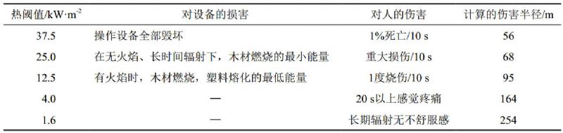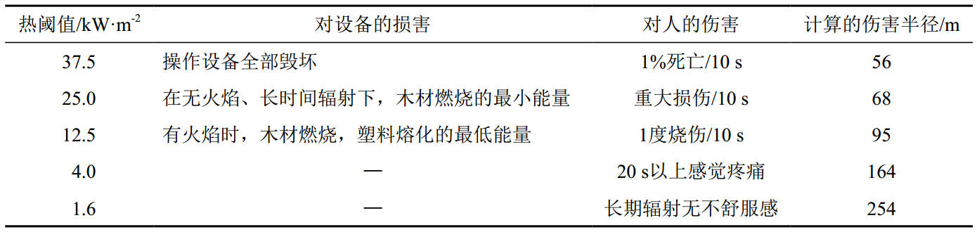 天然气长输管道多数埋设于地表以下,管道发生泄漏时遇到火源会被直接点燃形成喷射火。按照最不利情形并结合实践经验进行假定,以管口完全断裂形成水平喷射火作为研究对象,分析计算水平喷射火热辐射通量并根据已知不同目标的热毁伤阈值进行反算[1],从而得到水平喷射火的伤害半径。同时,采用热辐射强度准则,对比已知不同目标的热毁伤阈值,可以得到相应的伤害半径[2],结果见表 3。