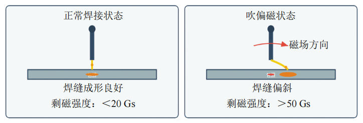 在氩弧焊接过程中,焊接电弧本质上是高温等离子体流,由电极与工件之间的高电压击穿空气形成。当管道存在较强的剩磁时,磁场会作用于电弧,产生洛伦兹力,迫使电弧偏离焊缝中心,即所谓“电弧偏吹”现象(图 1)。这种干扰会使焊缝金属熔深不均,根部成型困难,导致“未焊透”“烧穿”“咬边”等缺陷,严重时甚至无法稳定引弧,直接影响焊接作业开展。已有研究指出,电弧偏吹现象的严重性与剩磁分布及磁通方向密切相关,合理消磁处理是提升焊缝质量的关键[2]。
