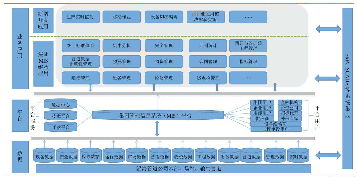 (3)信息化应用程度不高 。公司MIS(Management Information System)管理信息系统(图 3),一方面充分利用集团已建MIS成果,在现有基础上扩展、深化;另一方面,要根据沿海管道公司业务特点进行针对性开发。目前处于运营初期阶段,信息化建设项目零散且缺乏整体协调,尚不具备数据分析等功能,员工应用尚不够熟练,信息化工具的应用有待进一步开发完善。