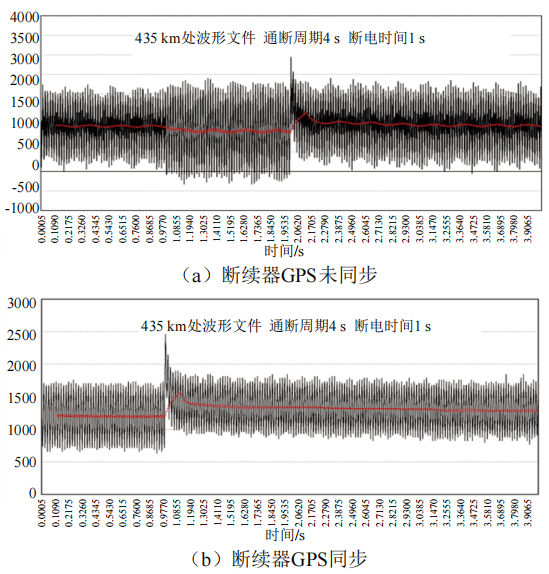 在管道沿线恒电位仪上加装GPS同步断续器,并使用CP-Thinker记录仪采集管道沿线的电位波形,需确保全线断续器及记录仪GPS同步。若未实现同步,采集到的通断电位将出现偏差,可能导致对管道阴极保护有效性的误判。图 1分别展示了断续器GPS不同步和同步情况下的电位波形。