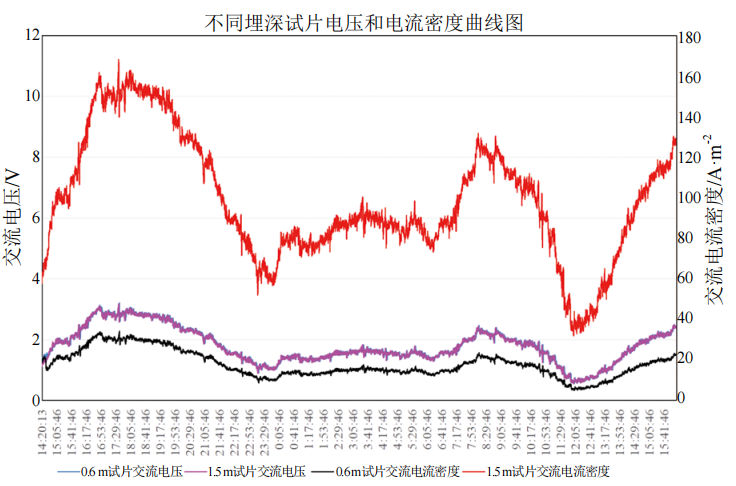 图 5展示的是在同一位置、同一时段下,不同埋设深度的试片所测得的交流干扰数据。两个试片的交流电压基本一致,交流电流密度存在明显差异,评估的交流干扰腐蚀风险等级也不同。这种差异源于不同土壤电阻率,导致试片发散电阻显著不同。