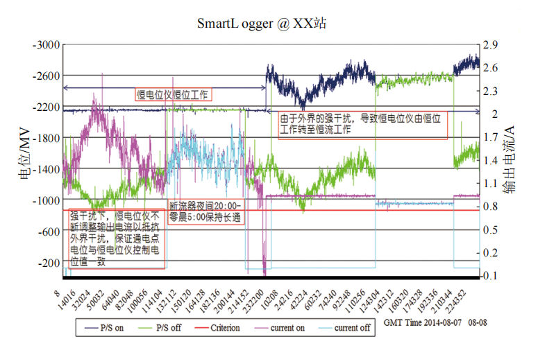 在直流杂散的检测过程中,用CP-Thinker记录仪记录恒电位仪的输出电流和通电点电位。