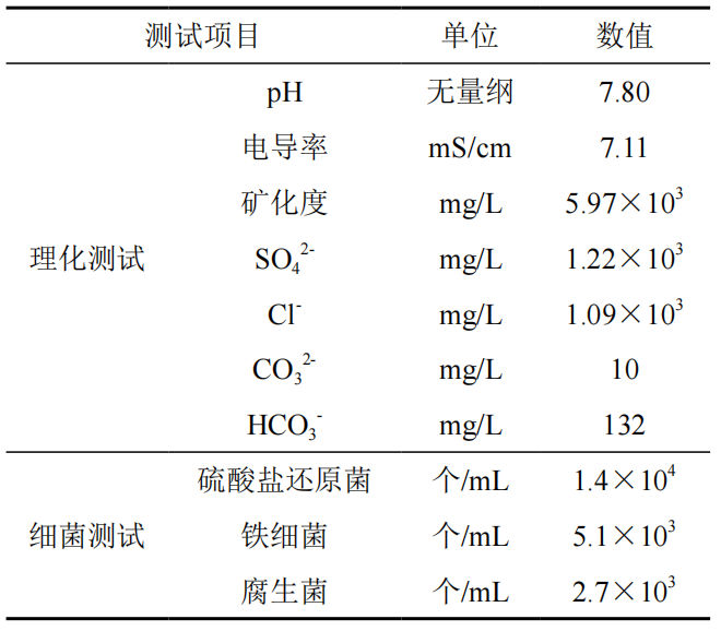 针对地下水样进行理化性质分析,参照SY/T 0532―2012《油田注入水细菌分析方法 绝迹稀释法》附录Ⅲ采用测试瓶进行水样内硫酸盐还原菌(SRB)、铁细菌(FB)和腐生菌(TGB)的数目测定。测试结果如表 1所示,水样pH为7.8,呈弱碱性,含盐量较多。