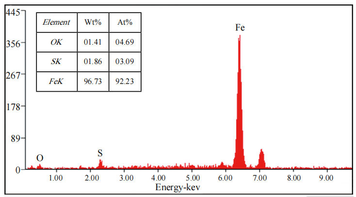 腐蚀产物形貌及元素分析。腐蚀产物宏观形貌如图 1所示,呈不规则球状,外壳为黑色,内部为棕黄色。腐蚀产物微观形貌及元素分析如图 2所示,可以看出腐蚀产物内部和外壳均存在杆状微生物细胞,内部附着较少,外壳附着较多。元素分析结果显示黏附物含有大量的Fe、O和S元素,并含有少量的Si、Ca等元素,腐蚀产物内部S元素含量为2.51 wt%,腐蚀产物外壳S元素含量为1.86 wt%,S元素的存在表明环境中存在SRB。