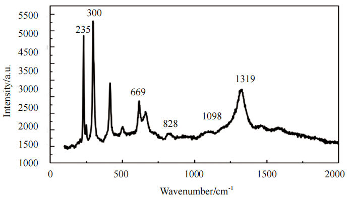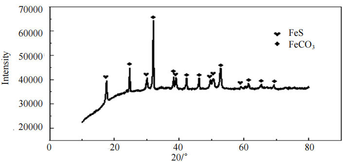 腐蚀产物成分分析。腐蚀产物XRD图谱如图 3所示,腐蚀产物主要由FeS和FeCO3组成。腐蚀产物的Raman光谱如图 4所示,内、外腐蚀产物Raman峰位置大体一致,强度略有不同。208和293 cm-1附近的峰为FeS对应的特征谱线;1084 cm-1附近峰为FeCO3;在669~750 cm-1附近出现Raman峰,说明有Fe(OH)2/Fe3O4产生。Raman分析表明腐蚀产物主要为铁氧化物、FeS和FeCO3。
