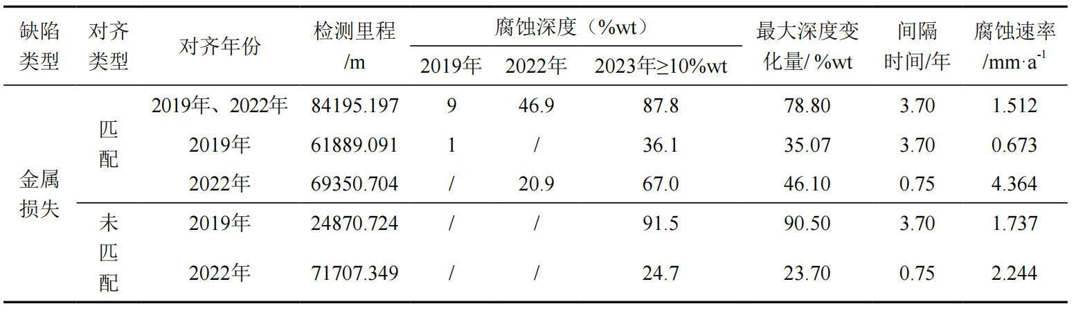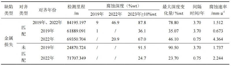 表 2 金属损失最大深度变化量按对齐年份统计结果表
