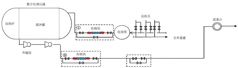 将站场工艺管道划分流程单元,在各个流程单元的有效作用距离内,配套可拆卸短节式牺牲阳极装置,实现牺牲阳极保护。以数字化增压站为例,在收球筒出口和外输泵出口分别安装改性牺牲阳极短节(图 3),配套旁通流程,可以实现收球筒至缓冲罐和外输泵至出站口全段流程防腐的目标,并与站外管道HCC内防腐无缝衔接。