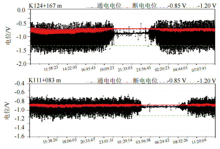 查明干扰源。管道K132+626 m与K124+693 m两处测试点与地铁交汇。利用数据记录仪(uDL-2型)对两处测试点阴保电位进行24 h检测。结果表明,通/断电电位在白天5:30至23:00波动剧烈,夜间23:00至5:30电位几乎不波动,该规律与地铁白天运行、夜间停运时间相吻合,充分说明地铁运行是造成管道电位异常的主要干扰源。