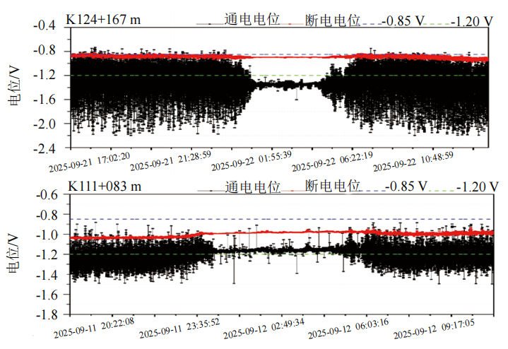 实验结果表明,馈电段管道的断电电位基本稳定在SY/T0087.4标准要求的评价指标﹣0.85 VCSE~ ﹣1.20 VCSE区间,无明显正向偏移,表明治理措施能抑制杂散电流干扰,使区间内管线处于有效保护状态。若区间内存在极个别欠保护位置,后期应考虑通过施加极性排流的方式进一步优化防护效果。