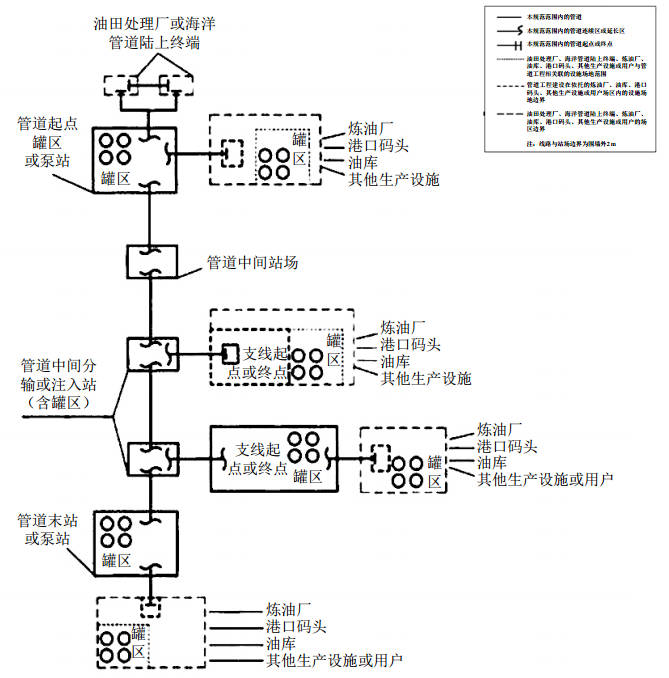 2014版规范修订工作于2011年立项,标准编制组深入调查研究,认真总结经验,参考有关国际先进标准,并广泛征求意见,历经3年修订而成。修订的主要内容有:与法律法规、标准规范的协同;规定了与上下游企业和设施的界面划分范围(图 1);补充、修订管道并行敷设的相关规定;增加了管道水工保护的相关规定;补充、修订有关原油管道加热、顺序输送的相关规定;补充、修订有关成品油管道顺序输送工艺设计的相关规定;修订了输油站内管道的许用应力计算相关内容等。