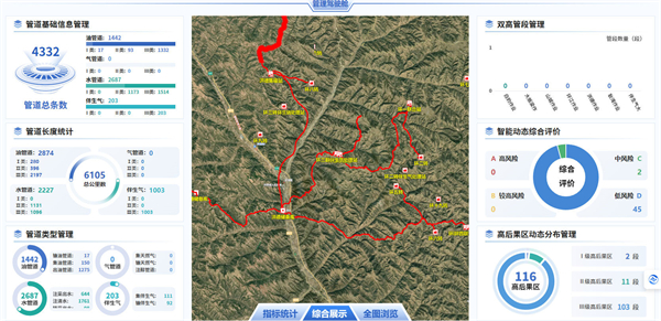 高后果区紧抓管道运行的“敏感区”,包括统计分析、地图分布和动态管理等3大模块17项内容,平台共识别Ⅰ、Ⅱ、Ⅲ级高后果区116处,并对高后果区的影响因素进行分类,明确河流、居民区、湖泊、铁路、公路等因素占比。同时可对某一区域进行高后果区识别,也可对某一条管道进行高后果区识别,展示高后果区的管道位置、管段长度及高后果区等级、特征、影响因素等信息,满足各级管理者的管理需要。