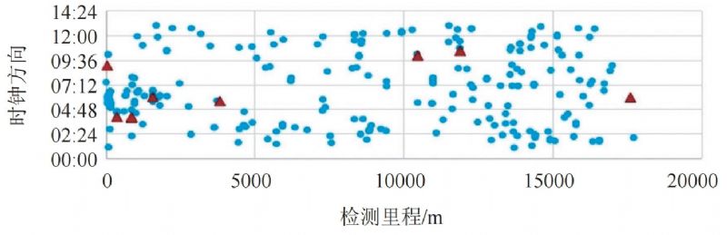 外部金属损失和内部金属损失周向位置沿检测里程分布分别见图 1、图 2。