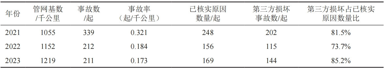 根据中国城市燃气协会安全管理工作委员会2021年至2023年《全国燃气事故分析报告》统计(表 1),燃气管道第三方损坏事故占管网事故总数的70%以上,且呈逐年上升趋势。2023年全国管网事故有211起,事故率0.173起/千公里,因第三方损坏引发的事故达144起,占已核实事故原因的管网事故数的85.2%。