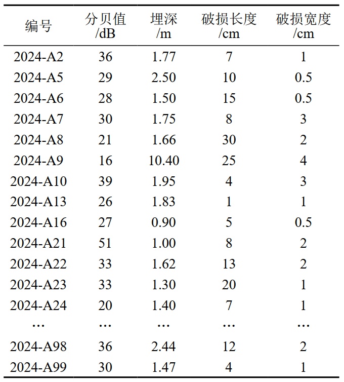 银川市环城高压燃气钢质管道全长83 km,2009年开始建设,2014年投入运行,管径610×8.7 mm。设计压力4.0 MPa,运行压力约3.0 MPa,管道防腐层采用三层聚乙烯(3PE),阴极保护采用强制电流。2024年采用英国雷迪公司生产的PCMx进行全线外防腐层检测,现场精确记录了每个破损点的管道中心埋深,破损处的最大长度和宽度,对检测出的破损点进行了开挖修复。从中筛选出信息齐全、破损面积较容易衡量的59个破损点作为有效研究样本,选取典型数据如表 1所示。