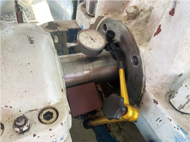 通过以上检查,排除了密封件自身质量问题及污物侵入因素后,排查聚焦于以下两个关键问题。一是弹簧卡滞与驱动槽磨损。拆解机械密封后发现动环倾斜,其支撑弹簧一侧未正常弹起,进一步检查发现动环驱动槽存在严重磨损(图 1)。二是密封安装面垂直度超差。使用百分表对泵壳密封安装面进行打表测量,发现其与轴线垂直度存在严重偏差。驱动端垂直角度偏差最大达0.35 mm,非驱动端为0.19 mm,均远超≤0.15 mm的标准值,且均为“下张口”(图 2)。