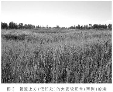 有村民反映管道上方的农作物初期生长速度较快,后来枯萎,不能出穗或结实,这是因为生长初期土壤墒情较好,而管道附近的土壤温度高出其他地方;后来的枯萎是水分蒸发后植物缺水造成的。