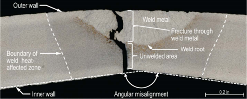 (4)132管线断裂源于纵向焊缝存在的未焊透缺陷,这是塑性裂纹和疲劳裂纹逐步扩展导致管道承压能力下降引起的管道破裂。