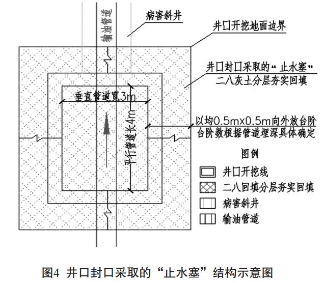 关键工序一: 斜井上、 下井口的开挖按0.5m×0.5m台阶形式从地面向下开挖, 使斜井井口下口顺管道方向长4m, 垂直管道方向长3m。斜井井口地面开挖尺寸根据管道具体埋深确定,开挖深度至管底0.5m为准。 确保井口采用二八灰土分层夯填形成的“止水塞”能完全封堵斜井井口, 有效拦截地表水及顺管沟的潜流。