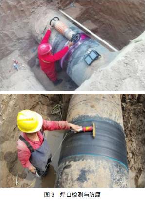 作业坑开挖完成后,检测和防腐单位进场作业。为达到环焊缝质量隐患排查标准化目的,项目部编制了《环焊缝焊口数据采集作业管理规定》《环焊缝焊口无损检测作业管理规定》《环焊缝防腐补口作业管理规定》,分别规范原防腐层情况、焊口基本信息、焊口打磨、焊口检测和防腐等作业,依据各项管理规定所要求的操作标准,在作业现场记录焊口排查的详细内容和实施情况,各工序操作人员分别填写环焊缝补口调查数据采集表、环焊缝排查开挖焊口信息采集表、环焊缝UT、 PT/MT缺陷记录表和环焊缝防腐补口记录表,并经现场监理工程师审核签字后归档待查,焊口检测和防腐如图 3所示。