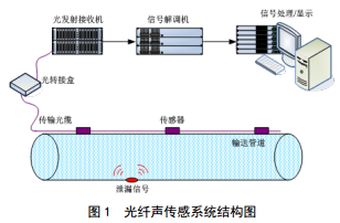 安全监测的重点是在线运行、且超设计寿命周期运行的老旧管道。一条几百上千公里的管线,可能只需要针对高后果区或者局部存在安全隐患的区域实施安全监测。源自军工技术的准分布式光纤声传感技术在这种情况下具有先天优势,只需按照合适的间距 (几百到几千米)在管道沿线挖坑黏贴安装传感器(无需动火、开焊),如果沿途有通信光缆,可用富余的光纤连接传感器,也可通过无线网络把采集到的信号上传至监控中心。无须沿着管道全线开挖敷设光缆,工程施工量较小、工期短,组网灵活方便,综合性价比高。准分布式光纤声传感系统结构见图 1。