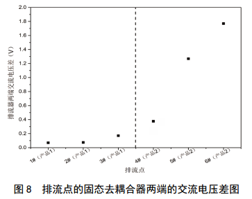 固态去耦合器两端的交流电压差是由通过的交流和其交流阻抗决定。排流量大和交流阻抗较大时,都会造成其两端的交流电压差大。图 10为各个排流点的固态去耦合器交流阻抗测试结果,可以看出产品2的交流阻抗远大于产品1, 6#排流点交流阻抗达到 0.37 Ω,如排流点的电流达到产品标称的80 A时,固态去耦合器两端的交流电压差将达到29.6 V,在影响管地电位的同时,也将影响排流点的排流效果,因此在排流量较大时,固态去耦合器的交流阻抗直接影响排流效果。