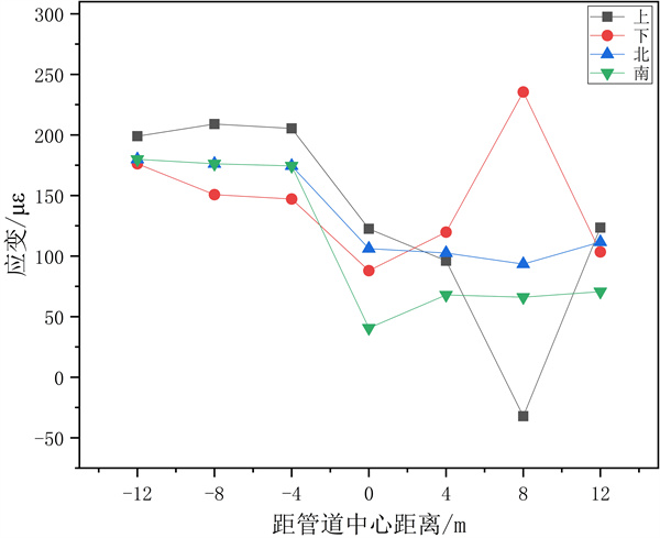 集中载荷F3作用条件下,最大应变值240με,在距管道中心﹣8 m位置处,即管道1/4处。管道开始端比结束端应力值小,与无集中载荷作用时相比,管道中点的应变值略微增大,而管道开始端的应变值则变小,结束端则变大。