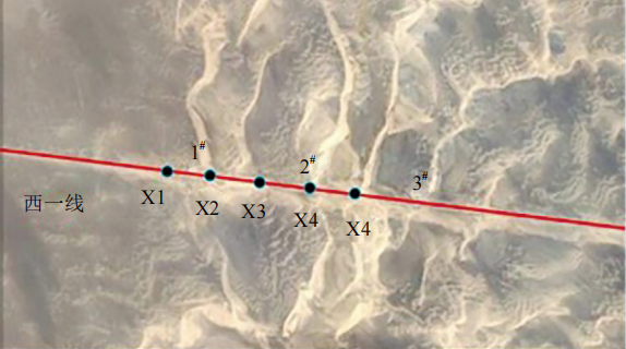 2017年以来,西部管道新疆输油气分公司对西一线管道KP788—KP793段穿越库木塔格沙垄处开展管道应变监测。选取五个典型截面,其中X1、X2截面布设于1#沙丘两端覆沙较薄段, X3、X5截面位于2#沙丘两端覆沙较薄段,X4截面位于2#沙丘中部覆沙最厚段,截面间距约60 m(图 4)。