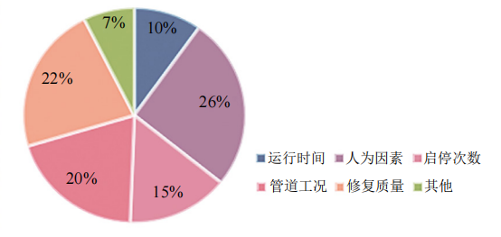 从图 3可以看出,人为操作因素、密封修复质量、管道工况、启停次数是密封故障的主要因素,合计占比为83%,其次是离心压缩机组运行时间和其他因素占17%。