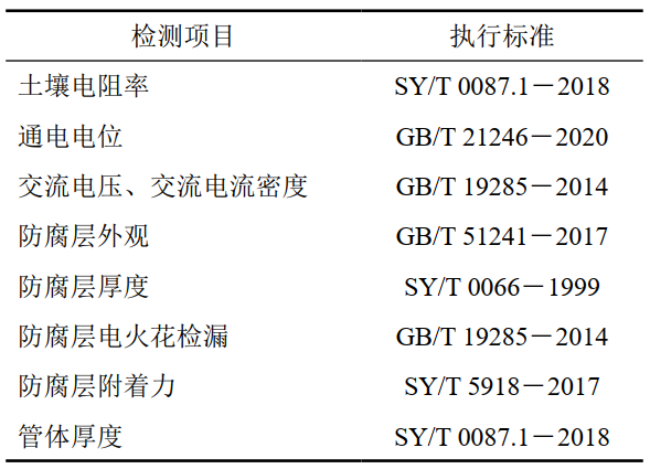 两处检测点按“测试桩编号+偏移距离”分别命名为KP10-809.5 m和KP12+281 m。首先对两处液体聚氨酯管道补口进行现场检测及样品采集。其中,土壤检测主要为管道补口附近土壤电阻率测试及样品采集,评估土壤腐蚀性;防腐层检测主要包括防腐层外观、厚度、漏点和附着力等检测及剥离防腐层采样,评价管道补口防腐层质量;电位测试包含管道通电电位(补口位置与上下游智能测试桩距离较远,不具备采集管道断电电位条件)、交流电压和交流电流密度采集,评估管道阴极保护有效性和交流干扰状况;防腐层下方管体壁厚测试以评估腐蚀类型和程度。各项测试执行标准见表 1。