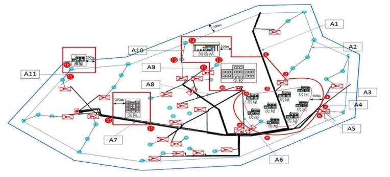 油田集输油管道大部分呈现为支状、网状结构,高后果区识别难度较大,通过实践总结,形成了符合油气田特点的区域识别法(图 4)。根据管网年代、环境、介质、管材等主要风险因素,以平滑曲线连接边界,将边界线以平行趋势向外延伸200 m,以延伸后的边界线包含区域作为一个识别单位,统计管网单元内的特定场所、易燃易爆场所、人口密集区及该场所200 m范围内包含的管道或管段,此管道或管段即为高后果区管道。