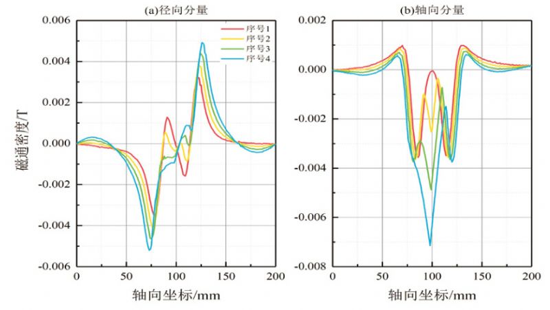 稳态仿真提取的漏磁场为沿着轴向变化的底噪磁场与漏磁场的叠加场。为了消除底噪磁场的影响,对稳态仿真数据进行了相应的去底噪处理。将漏磁检测数据与仿真数据进行对比,形成轴向、径向方向的漏磁场分量曲线图形。