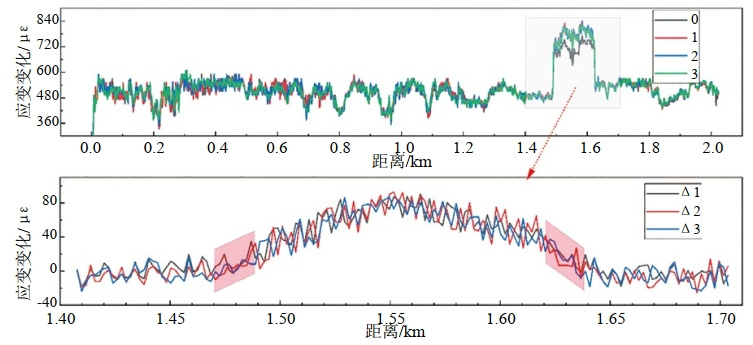 图 8 罗针田滑坡段管道伴行光缆应变检测曲线(上图)及不同时段应变变化(下图)