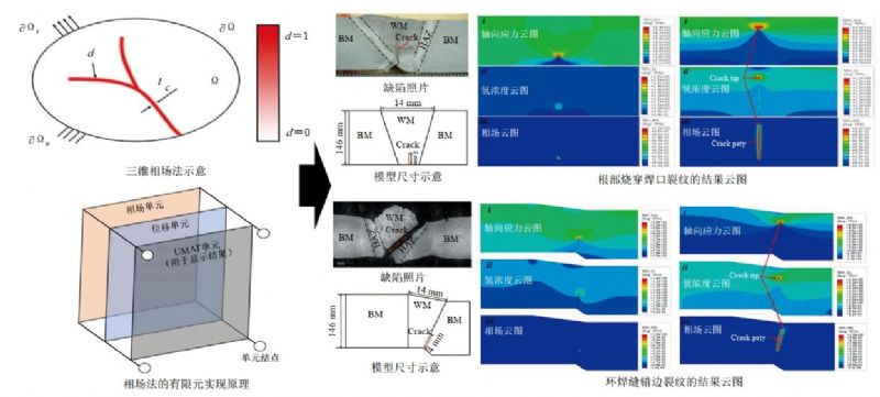作为一种典型的弥散方法,相场法用一个标量场,即相场,描述尖锐裂纹拓扑。相较于XFEM、CZM,相场法避免了对不连续边界的数值追踪,并且不需要预估裂纹路径。利用相场法建立焊缝根部烧穿缺陷与错边缺陷模型进行模拟(图 4),结果表明由于裂纹尖端处的静水应力较高,随着裂纹的扩展,氢聚集于裂纹尖端处并且裂纹尖端的氢浓度出现了下降。此外,通过对比两模型还可以发现,不同的缺陷类型导致了裂纹扩展路径的变化,模拟结果与实际相符。