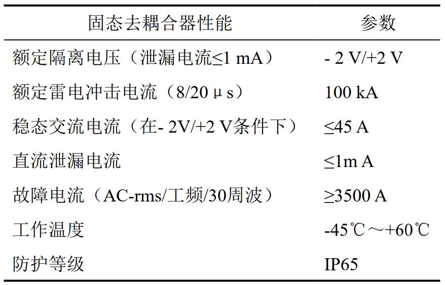 (2)固态去耦合器的选择。作为直流隔离和交流导通装置,当两个端子之间的电压超过直流导通阈值时,固态去耦合器呈现直流低阻抗导通模式;当两个端子之间的电压降低到直流导通阈值以下时,固态去耦合器重新对直流电流呈现高阻抗,切断直流电流。固态去耦合器在遇到故障电流或雷击电流冲击时,内部模块能瞬间导通,将干扰电流通过接地泄放入大地,从而起到了对管道设施和人员保护的作用(表 1)。