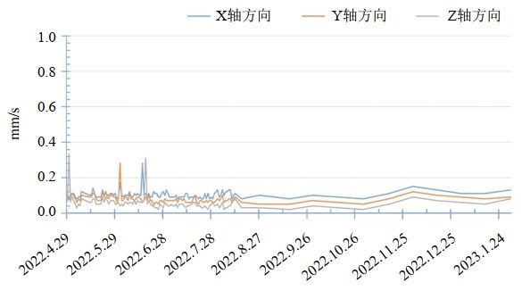 (4) 管道应力监测数据分析。施工后对管道应力应变、位移(沉降)、振动实施9个月的现场监测。应力监测时程曲线如图 3,在整个监测周期内,监测截面管道附加应力均处于较小值,最大拉应力6.93 MPa,最大压应力﹣8.95 MPa,远未达到蓝色预警值。累积沉降位移变化曲线如图 4,当前测点累积沉降位移值偏小,仅为﹣0.793 mm ,远小于安全阈值10 mm。2个监测截面振动速度随时间变化曲线如图 5、图 6,各测点振动速度值较小,均远小于安全阈值。其中,Z01测点沿Z轴方向振动速度最大值为0.86 mm/s,Z02测点沿X轴方向振动速度最大值为0.31 mm/s,均小于管道安全速度1.7 cm/s。
