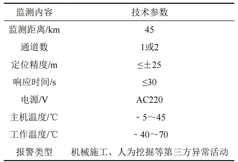 (1)技术原理。将光纤沿着管道敷设,利用光纤的光散射、折射率等特性变化来感知管道周围的温度、压力、应变等物理量。当管道泄漏时,泄漏介质与周围环境的相互作用会引起这些物理量的改变,光纤传感器能够实时捕捉到这些变化并准确定位泄漏位置。光纤传感技术具有分布式监测、抗电磁干扰、高灵敏度等优点,在管道泄漏检测中得到了广泛应用[2]。表 1是光纤传感监测的主要技术参数。