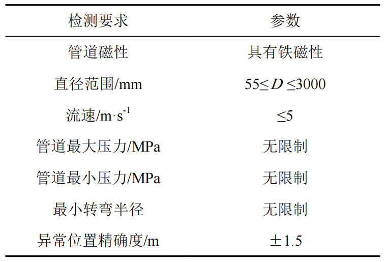 (1)技术原理。智能清管技术能够充分利用日常管道清管时机,通过常规清管器、测径清管器、钢刷清管器、变形清管器和漏磁清管器等一系列清管措施,对管道内部各类缺陷(凹陷变形、腐蚀减薄、焊缝异常等)进行检测。在清管作业过程中,它可以实时采集管道内壁的厚度、腐蚀情况、缺陷位置等信息,为管道的维护和泄漏预防提供数据支持[3]。表 2为常规漏磁清管器技术参数。