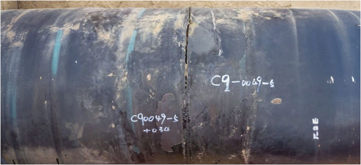 以长庆油田某采气厂输气管道为例,该管道全长60 km,采用光纤传感技术和物联网技术相结合的智能监测系统。2019年1月11日8:45,监控系统发出管道泄漏报警信息(图 2),根据压力下降幅度和报警顺序分析,准确定位泄漏位置位于2#阀室附近。指挥中心迅速通知相关人员现场核实及应急处置,确认该管道环焊缝处开裂导致泄漏(图 3)。应用光纤传感监测系统,有效提高了管道异常工况发现的及时性,防止了泄漏事件进一步扩大。