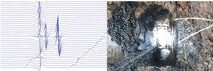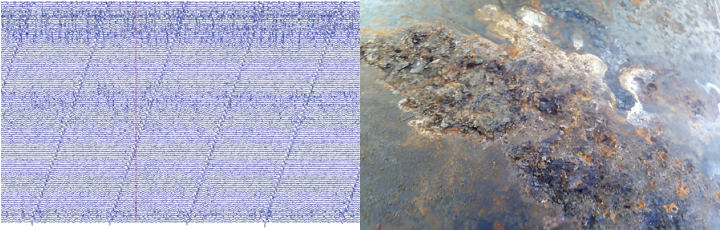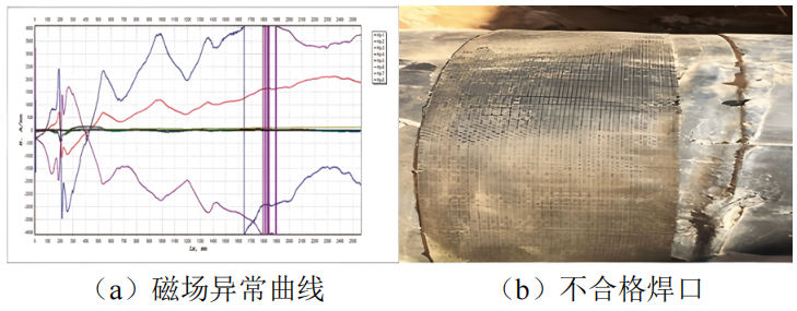 以某天然气集输管道为例,管道长度41 km,管径Φ508 mm×9/11 mm,运行压力4.87 MPa ~4.92 MPa。由于设计问题,该管道暂时无法进行智能清管器检测,于2024年开展了非接触式磁检测。检测发现:管道整体质量良好,无变形、无表面凹坑,防腐层破损28处,存在1处不合格焊口(图 5)。属地单位立即组织对缺陷管段进行更换及外防腐层修复,有效预防了管道泄漏事件的发生。