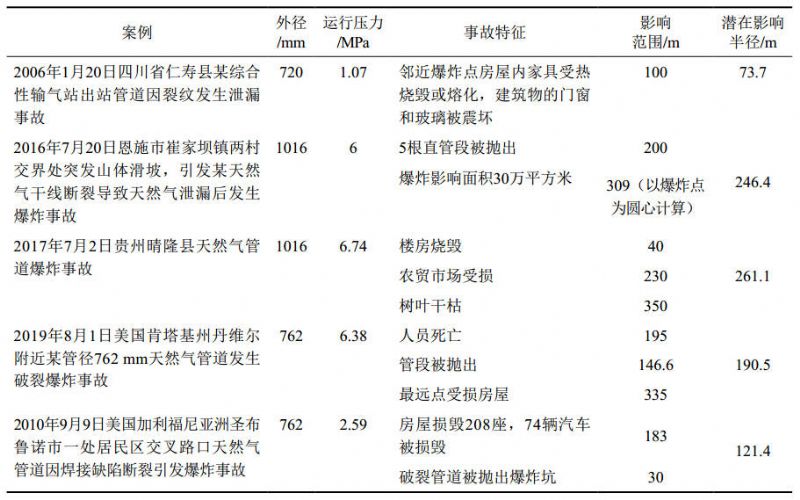 (5)以国内天然气长输管道常用设计参数为基础,兼顾考虑可接受损失、避免土地资源过度占用的前提下,建议将天然气长输管道与周边人员、建(构)筑物之间安全距离设定在300 m以内,并可根据不同管径、运行压力按照潜在影响半径制定具体的安全间距。此外,在天然气长输管道的设计、施工、运行管理、应急防范等过程中也可以按照这一方法采取措施预防较大以上事故。