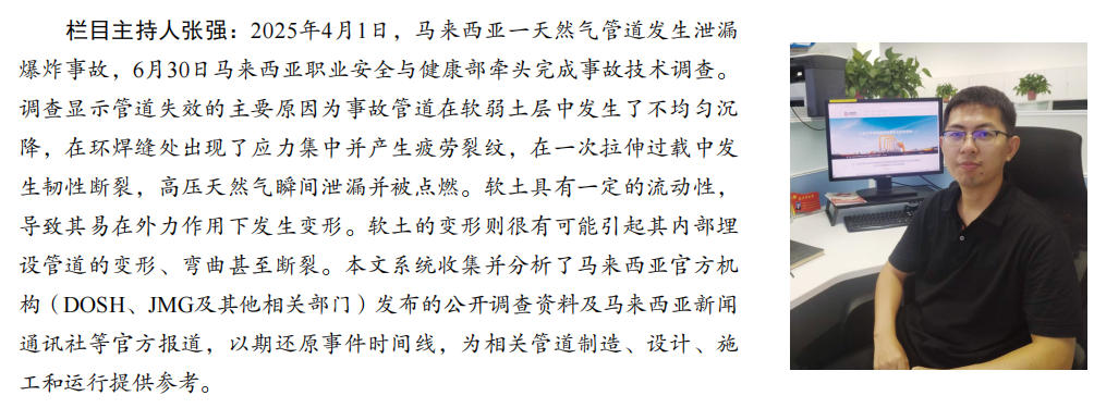 栏目主持人张强:2025年4月1日,马来西亚一天然气管道发生泄漏爆炸事故,6月30日马来西亚职业安全与健康部牵头完成事故技术调查。调查显示管道失效的主要原因为事故管道在软弱土层中发生了不均匀沉降,在环焊缝处出现了应力集中并产生疲劳裂纹,在一次拉伸过载中发生韧性断裂,高压天然气瞬间泄漏并被点燃。软土具有一定的流动性,导致其易在外力作用下发生变形。软土的变形则很有可能引起其内部埋设管道的变形、弯曲甚至断裂。本文系统收集并分析了马来西亚官方机构(DOSH、JMG及其他相关部门)发布的公开调查资料及马来西亚新闻通讯社等官方报道,以期还原事件时间线,为相关管道制造、设计、施工和运行提供参考。