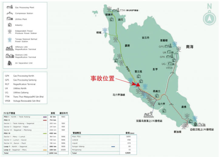 事故管道是马来西亚半岛气体利用率公司(Peninsular Gas Berhad,PGB)所辖半岛天然气管道系统(Peninsular Gas Utilization,PGU))的一部分,也是马来西亚最长的天然气管道。PGU管道系统干支线全长2623 km,管道呈“Y”字形,从1983—2000年分三个阶段建设,将登嘉楼、沙巴和沙捞越(Terengganu,Sabah和Sarawak)等近海气田开采的天然气输送到Kertih处理厂,再通过PGU管道系统输送到整个马来半岛,设计输气能力为20亿标准立方英尺/天(BSCFD),管径50.8 mm~1219 mm,为马来西亚半岛的电力、工业和商业领域的终端用户和新加坡的电厂提供管道天然气。