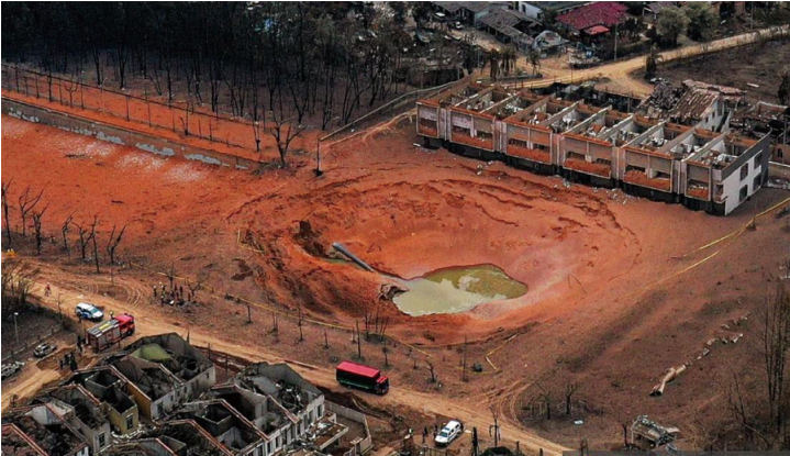 事故现场形成了巨大的椭圆形爆炸坑,深度约9.8 m、跨度约为80 m×60 m,约30000 t的土壤碎片散落在300 m的半径范围内(图 3)。从爆坑边缘30 m内的单层排屋仅剩地基和扭曲钢筋;60 m~100 m范围内屋顶瓦片被掀飞,墙体出现贯通裂缝。爆心50 m内12辆轿车仅剩焦黑车架,轮胎完全烧毁;距离爆心120 m处,路灯杆向爆坑方向弯曲30°,灯罩熔化呈“泪滴”状;汽车铝合金轮毂软化后重新凝固成不规则团块。150 m外车辆玻璃呈蛛网状裂纹但车体基本完好。爆坑边缘向外延伸150 m~200 m的扇形高温灼烧区,草皮完全碳化,呈黑白相间的“灰烬地毯”(图 4)。无人机航拍可见爆坑呈明显的“子弹形”,最远波及500 m外的棕榈树林,树叶呈放射状倒伏。