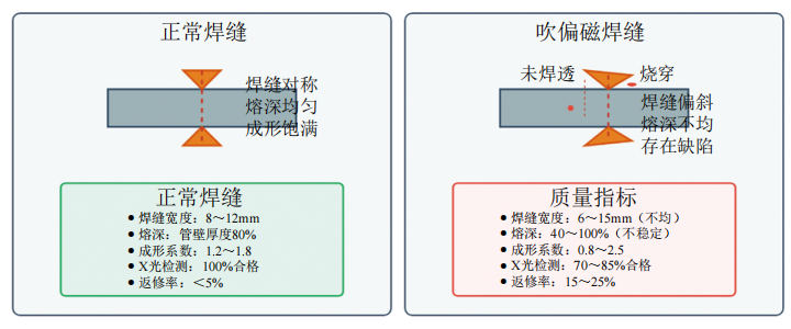 除了电弧稳定性,剩磁还会对熔池形态、焊缝金属的结晶方向及裂纹敏感性造成影响。具体表现为:熔池偏斜,即熔融金属受磁力偏移,焊缝呈现倾斜或偏心堆积;成型困难,即焊缝成型不饱满,波纹不均匀;微裂纹风险增加,部分案例显示,磁场可能影响熔池金属的凝固过程,使热应力释放受限,从而存在热裂纹产生的可能性;返修率上升,据2020年统计数据显示,漏磁影响焊口质量的返修率达15%以上,高于正常管段2~3倍(图 2)。