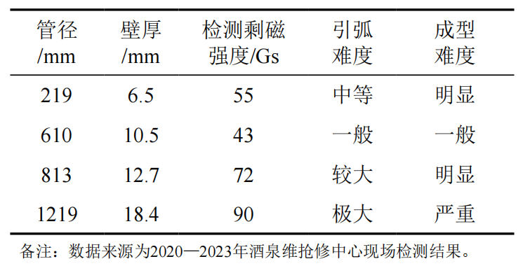 不同口径、不同强度等级的管道,在剩磁影响下的焊接敏感性不同。小口径(如Φ219 mm、Φ273 mm)因壁厚较薄,磁通密度集中,焊接偏吹现象更明显;而高强钢(如X70、X80)因晶体结构对磁的响应性强,也更易在漏磁后形成高残磁区(表 1)。