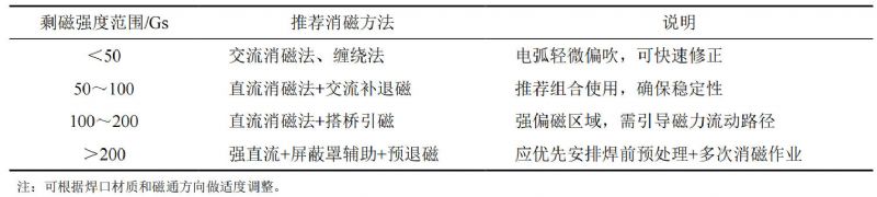 (2)分类制定消磁操作规范。根据工作实践,总结出一套可复制的消磁方法分类标准,结合管径、材质与磁场强度建立“剩磁等级判定与操作指南”。如:轻度剩磁(<50 Gs):直接采用交流消磁;中度剩磁(50 Gs~100 Gs):选择直流或组合方式;重度剩磁(>100 Gs):配合屏蔽罩、搭桥导磁等手段分步骤退磁;并同步制定“应急消磁SOP卡片”,张贴于作业车或集控车间,指导现场快速决策。