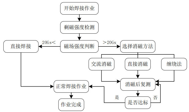 (1)完善剩磁检测流程。为实现精准消磁,应将“磁场强度检测”纳入焊接前的强制工序。作业人员应在焊口组对完成后,使用便携式高斯计沿焊缝两侧300 mm范围内开展全方位磁场强度测定,记录最大值与偏吹方向,并标记残磁区域。检测结果需由专业人员签字确认,并作为后续消磁方式选型依据(图 6)。